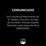 Armazém Paraíba informa fechamento nesta segunda em homenagem ao cofundador Sr. Valdecy Claudino